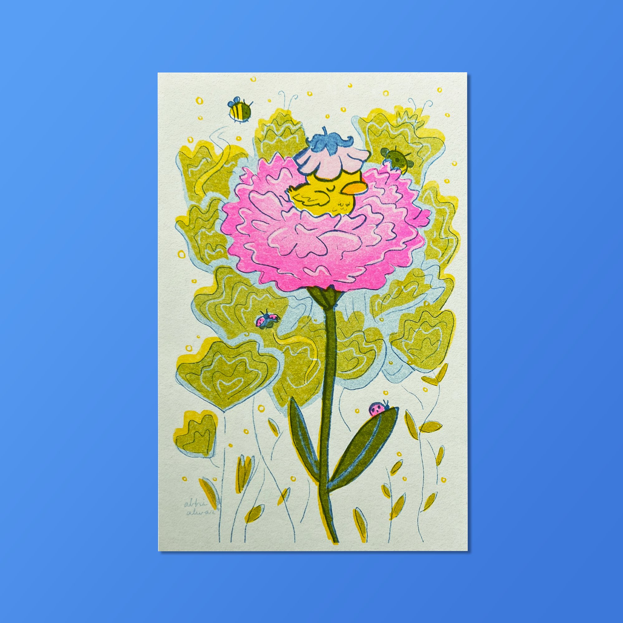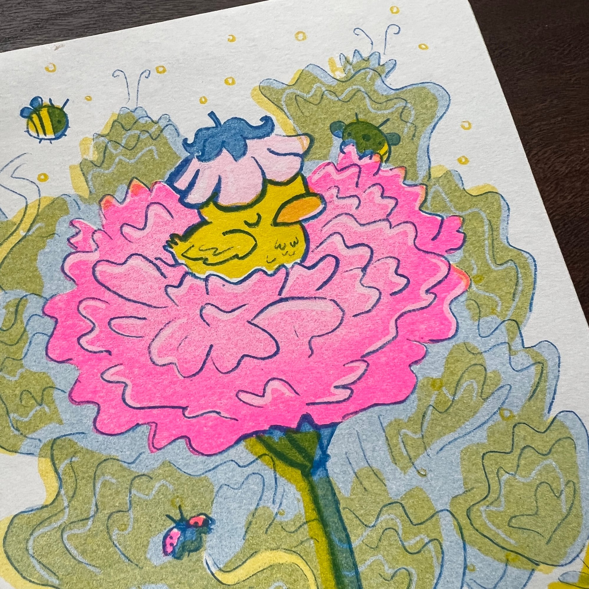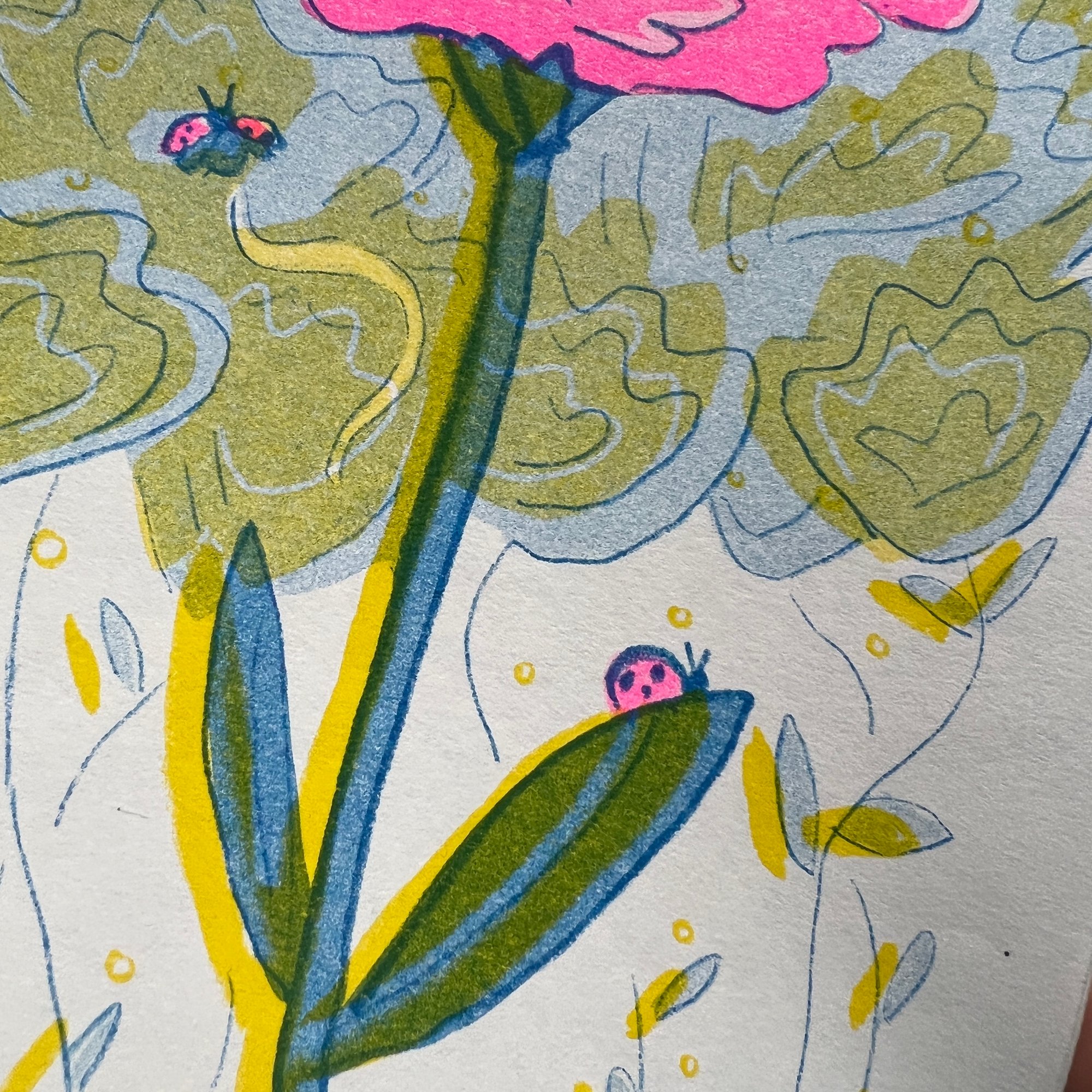 *No one print will be exactly the same! The riso (or risograph) printing process involves layering slightly transparent soy-based ink colors one at a time to create vibrant images. Because each color is printed one at a time, slight mis-registrations naturally occur, resulting in unique overlaps of color in every print.